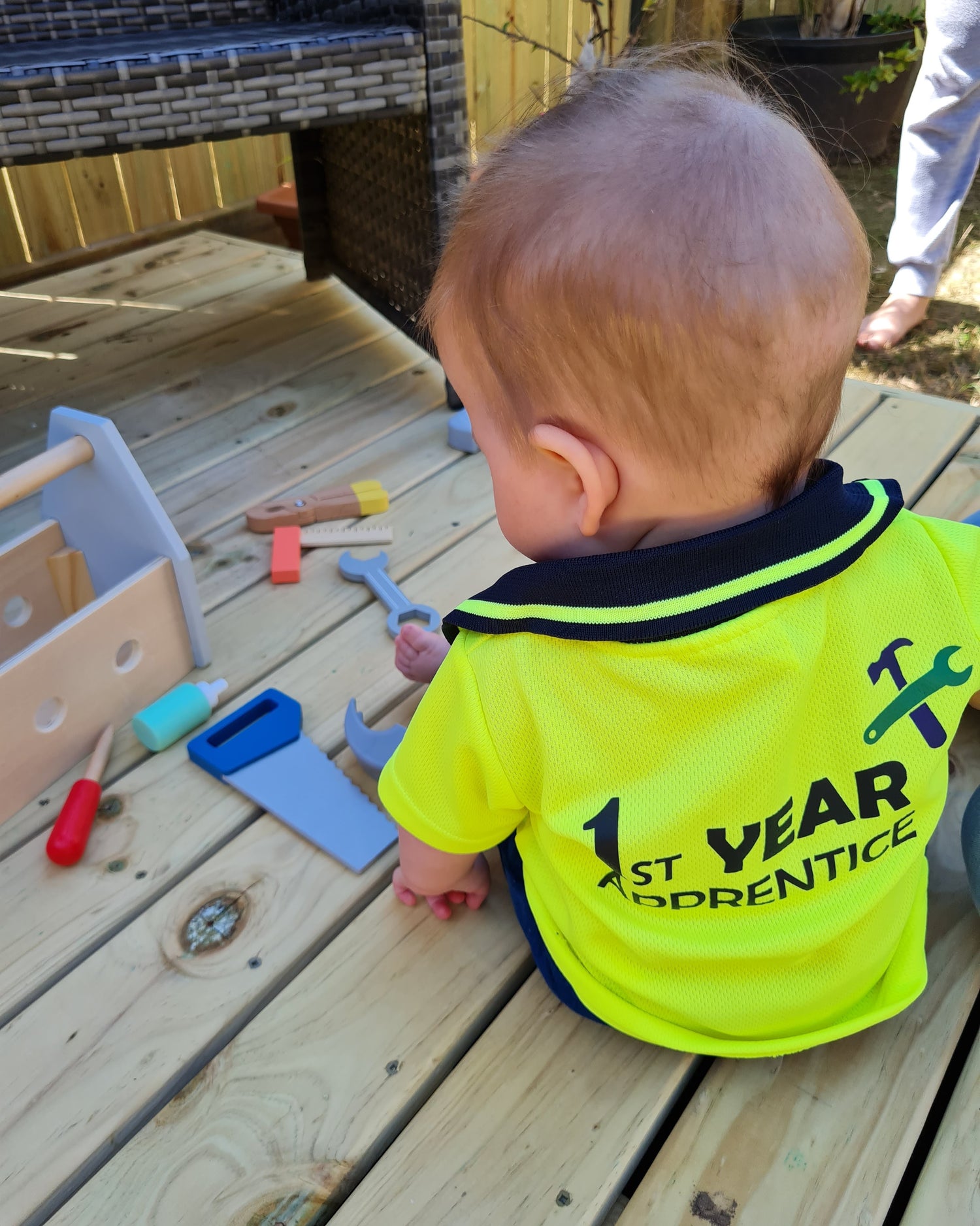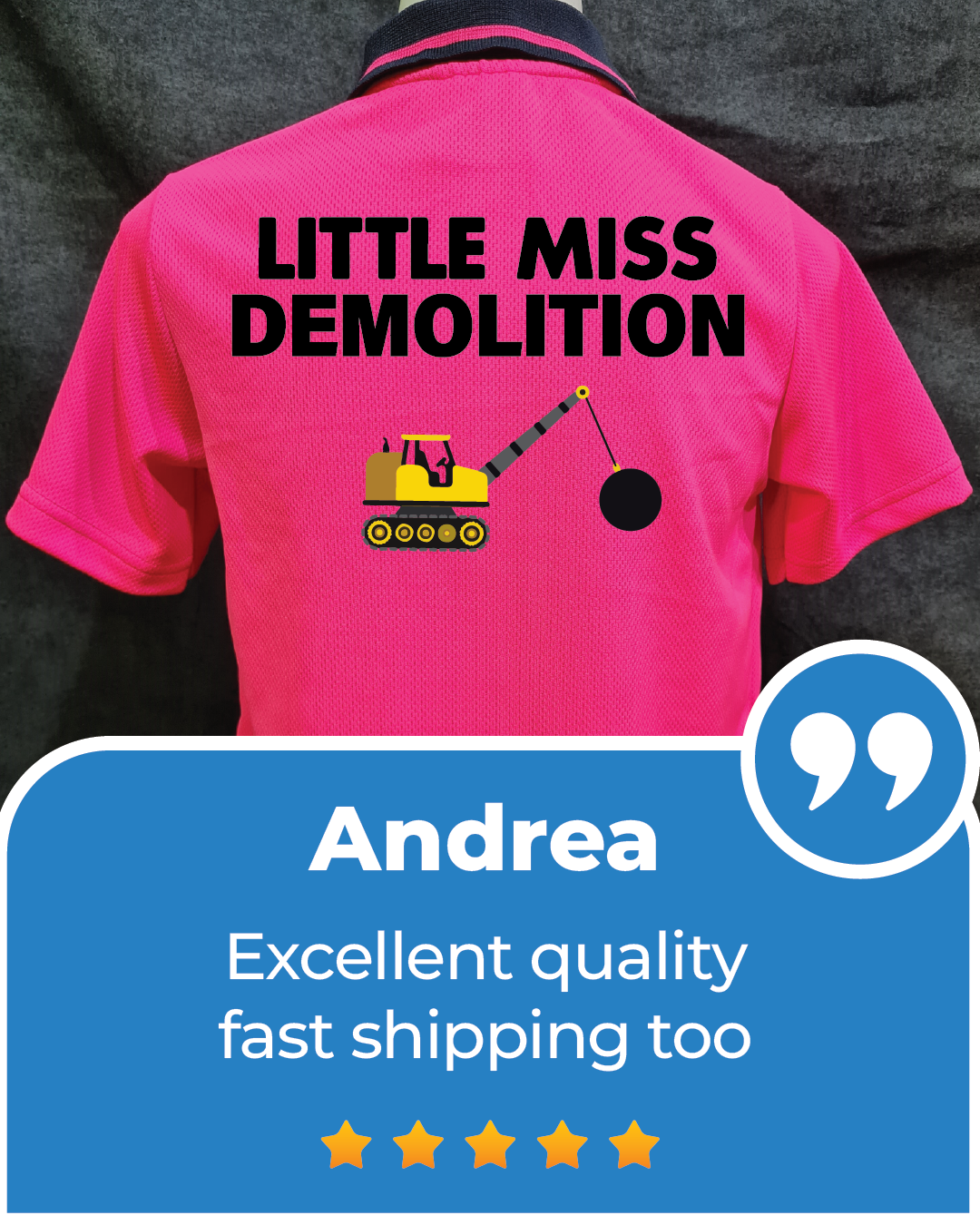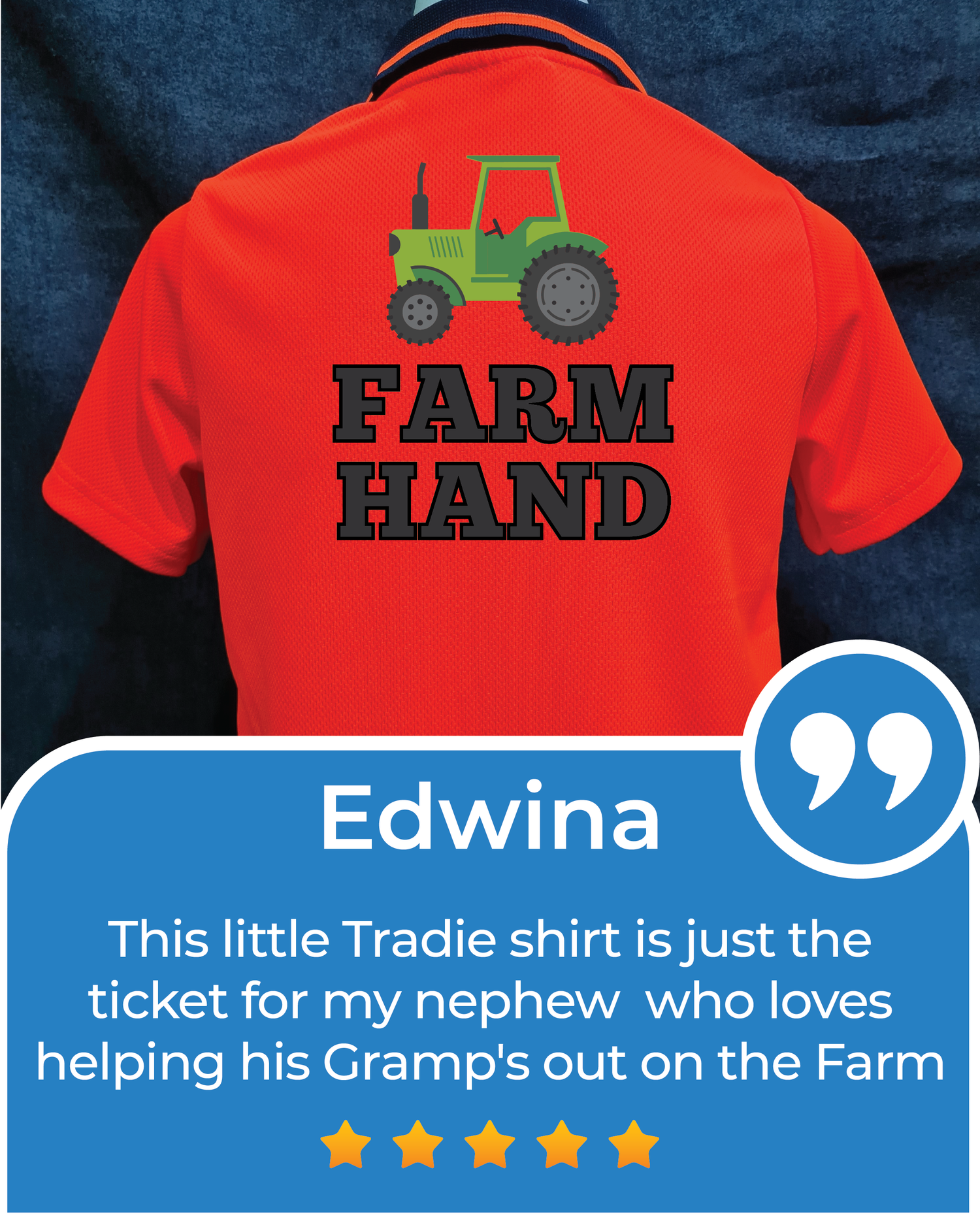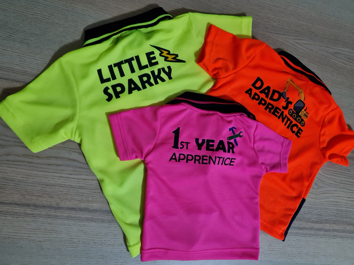 Australia’s leading brand of kids hi-vis tradie polo shirts for ‘Dad’s Boss’, ‘Pop’s Helper’ or the ‘1st Year Apprentice’. With over 30+ designs to choose from (and custom designs available) you’re sure to find the perfect shirt for the ‘Little Sparky’ or ‘Farm Hand’ in your family. These professionally screen printed designs were created right here in Australia.